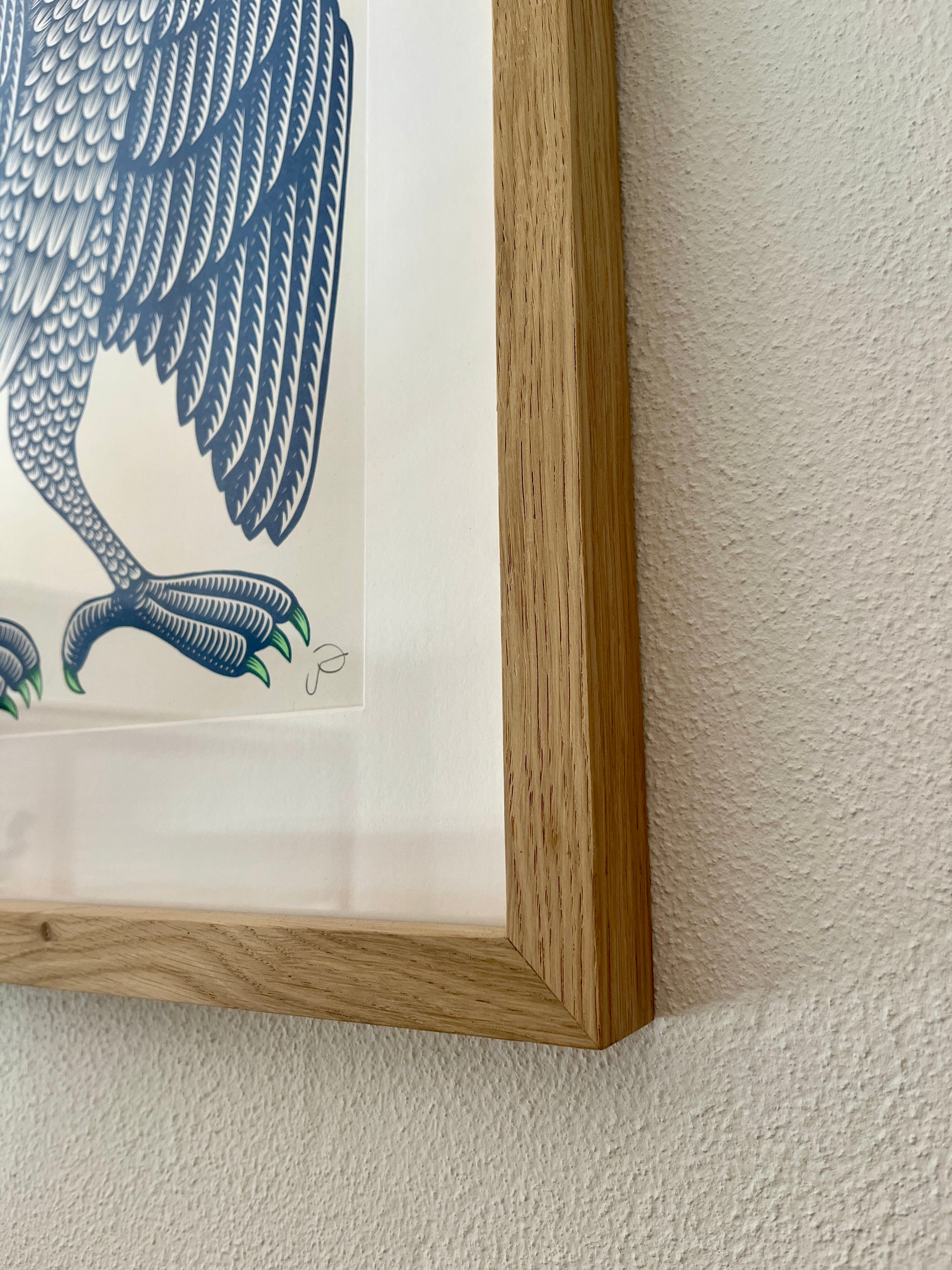 Der Risodruck "Eule" der nordirischen Künstlerin Jo Pearson vereint künstlerische Finesse mit hochwertiger Handwerkskunst. Das detailreiche Motiv wird von einem handgefertigten Rahmen aus unbehandelter, massiver Eiche aus nachhaltiger Forstwirtschaft im Schwarzwald eingefasst. Ein UV-beständiges, bruchsicheres 3mm Acrylglas schützt das Kunstwerk und macht es auch ideal für Kinderzimmer. Das säurefreie Passepartout und die präzise gespannte MDF-Rückwand garantieren eine langlebige Präsentation. Durch die praktische Drahtaufhängung lässt sich das Bild mühelos mit nur einem Punkt an der Wand befestigen – ein echtes Unikat, das in liebevoller Handarbeit gefertigt wurde.